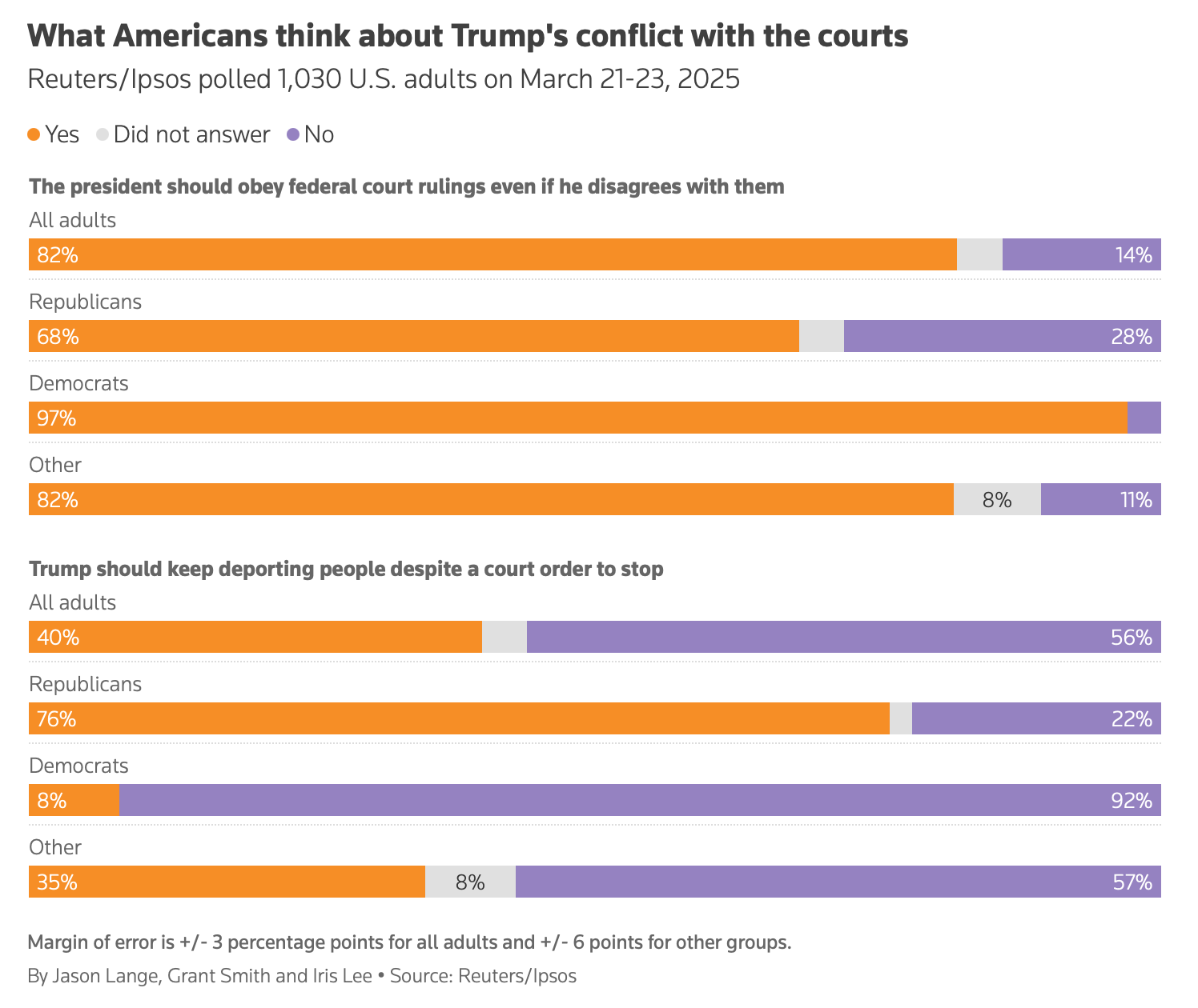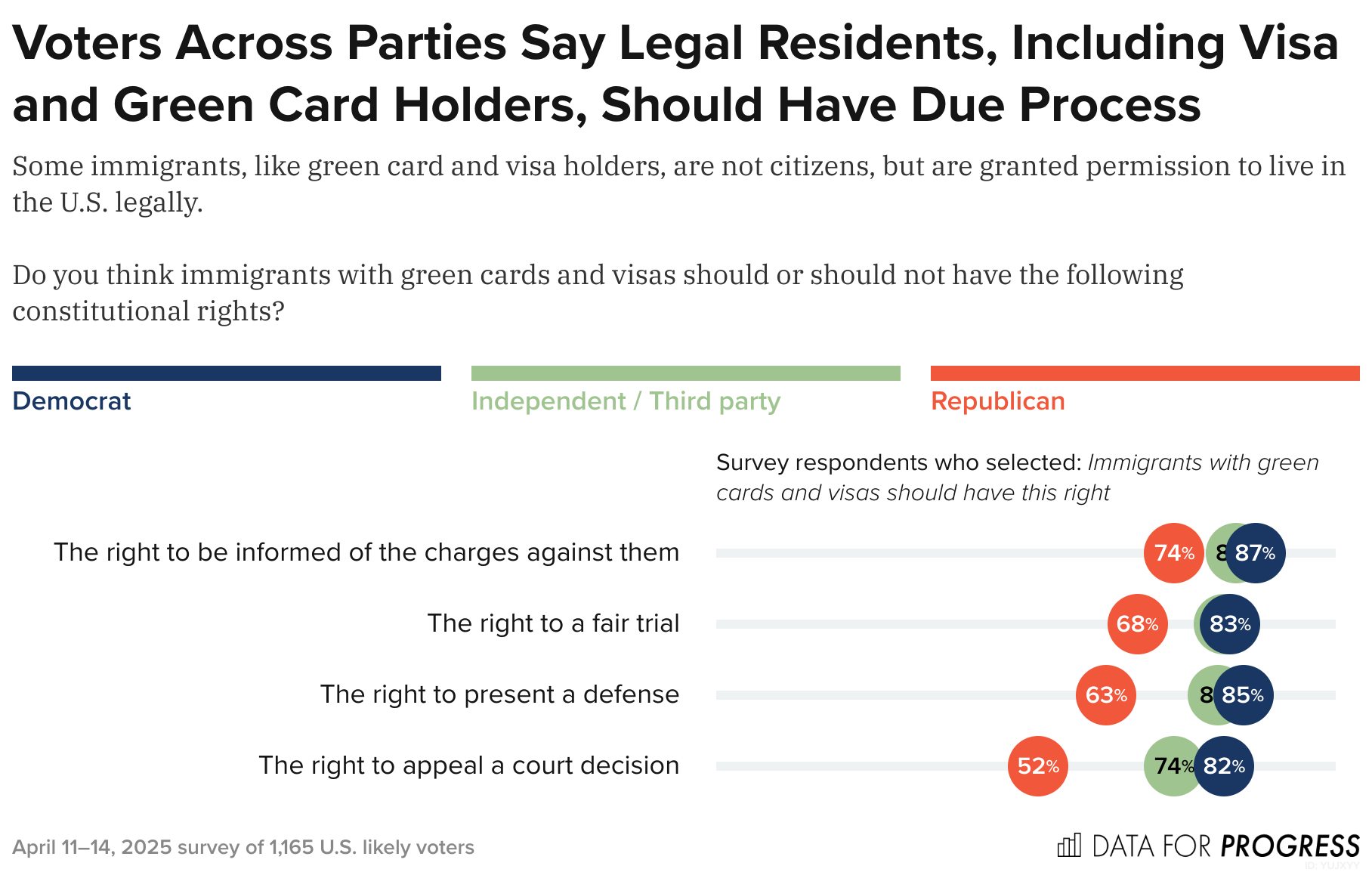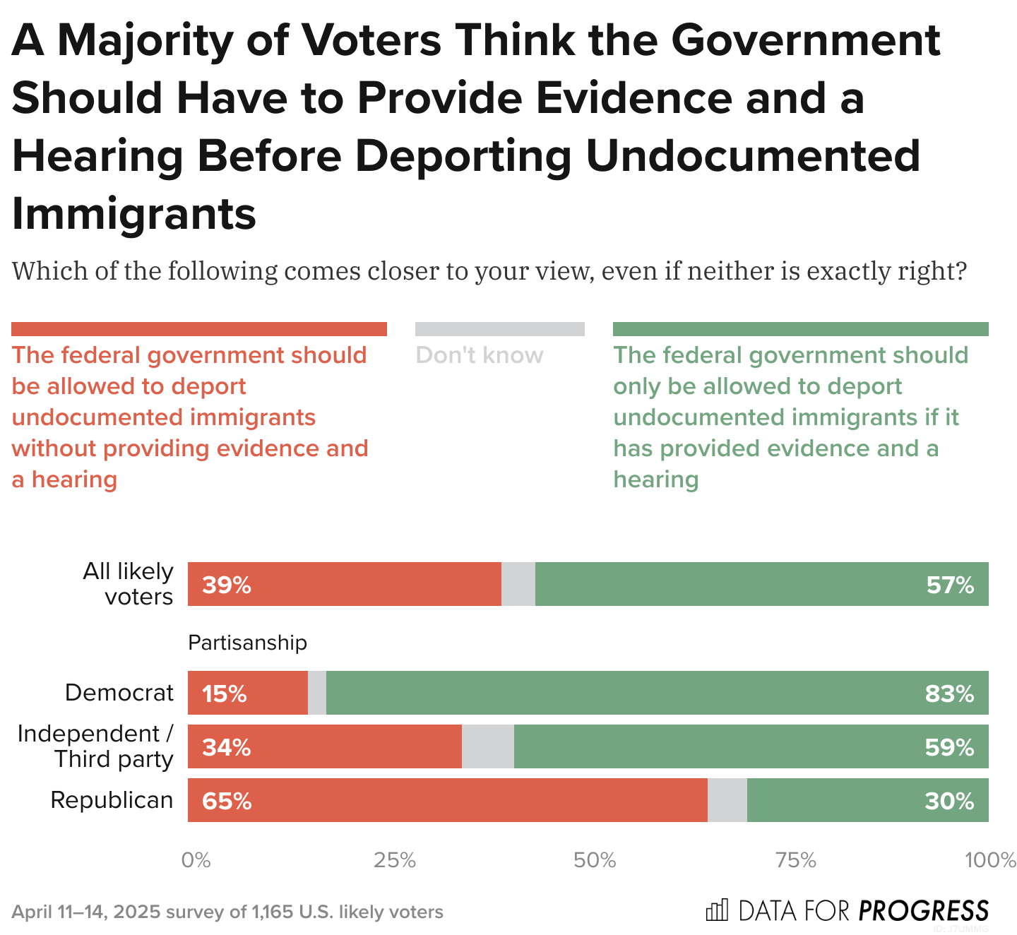 And apparently, “concern everyone” it does. A poll conducted by Data for Progress suggests that the vast majority of Americans unsurprisingly believe that even illegal immigrants are entitled to due process. An even greater number of people are opposed to permanent residents having their visas summarily revoked over speech issues, as has been the case with pro-Palestinian students across the nation. A different poll conducted by Ipsos suggests that a majority of Americans believe that Trump should comply with court orders to halt deportations to El Salvador.