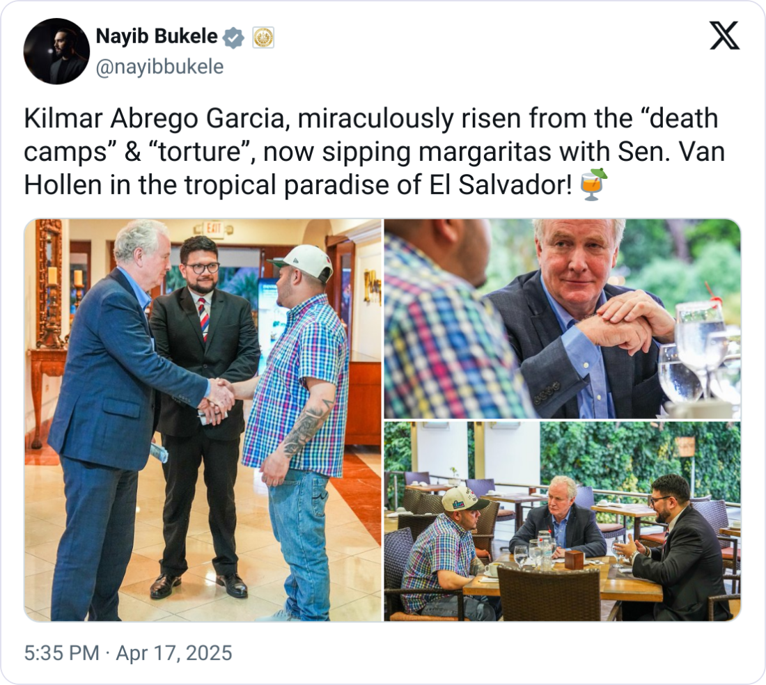 However, almost immediately, both El Salvador’s president Bukele and Trump ramped up their concerted propaganda campaign against the man. Ever since the Trump Administration admitted that deporting Abrego Garcia was performed in error, they have been toiling away to backpedal this admission by smearing and defaming him as a leading member of MS-13, only producing shoddy informant testimony from six years ago that fundamentally contradicts key details of his personal life (such as the idea that he belonged to a Long Island branch of MS-13 in spite of rarely being there and never living there), some tattoos on his fingers (that Trump shared doctored images of in a desperate ploy to connect the symbols to the name “MS-13”), and the fact that he wore a Chicago Bulls hat which, apparently, is supposed to bolster evidence of his connection to the gang. Then, upon coordinating the meeting between Van Hollen and Abrego Garcia, government officials in El Salvador had apparently placed margarita glasses in front of the Senator and Abrego Garcia so as to create the perception that the mood was light and that Abrego Garcia was not in imminent danger, and was, as President Bukele writes, “sipping margaritas. . .in the topical paradise of El Salvador!” Van Hollen says that neither man had actually sipped from their glasses, which can be inferred from the fact that the salt/sugar coating on the rims appears intact on both glasses.