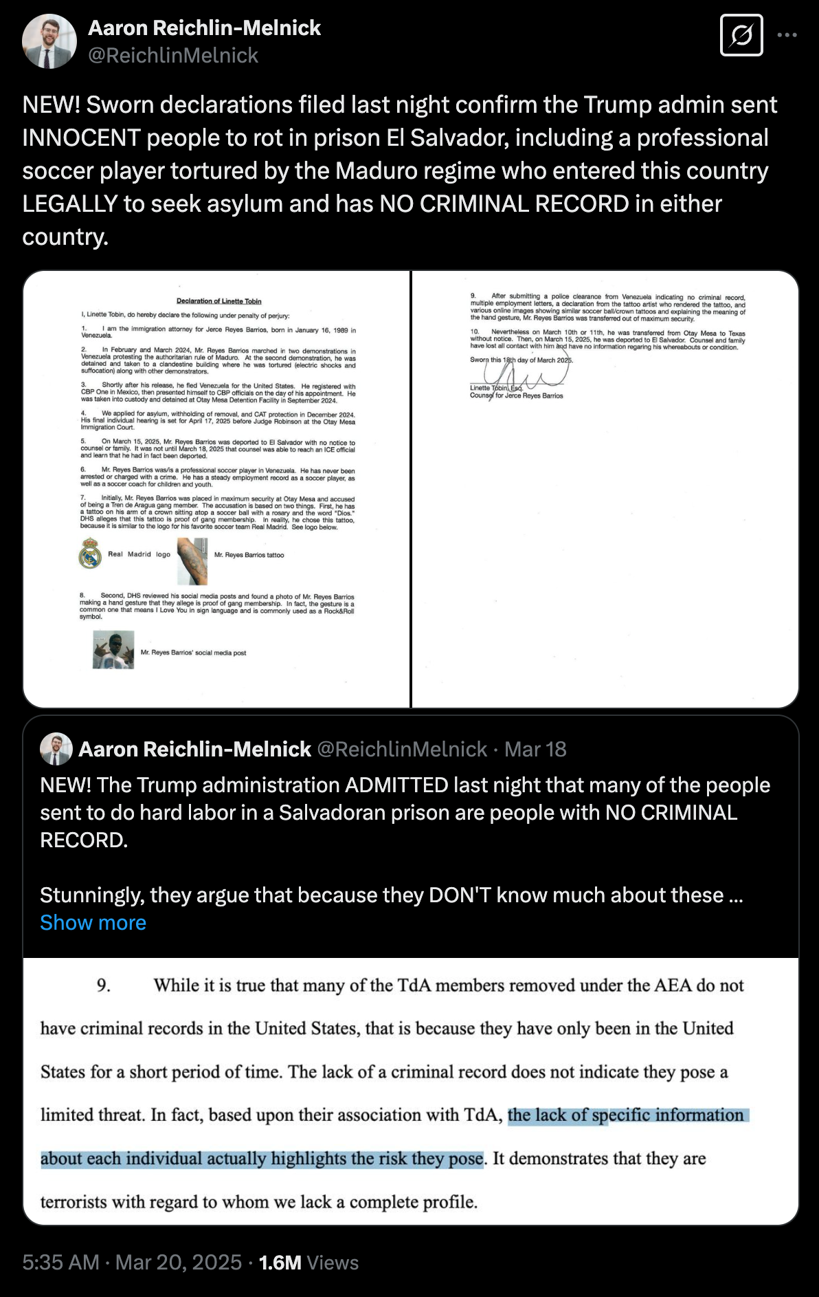 Trump has invoked a 1798 wartime law in order to justify deporting hundreds of Venezuelans to one of the most brutal prisons in the world without due process. The Alien Enemies Act was previously employed to justify Japanese internment. The Trump Administration has attempted to justify the deportations by baselessly alleging that all of the deportees are associated with the gangs Tren de Aragua and MS-13. Without due process, it’s impossible to know for certain, though easily available evidence already appears to be disputing these sweeping claims: