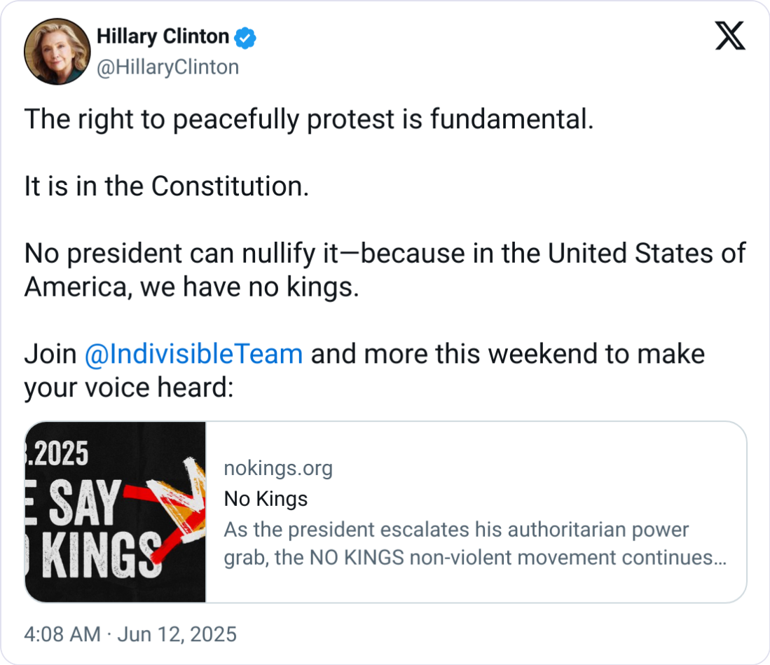 No Kings Day was largely the product of somewhat institutionally aligned actors. Most prominently, Indivisible, an activist movement started by Democratic Party staffers whose primary stated goal is electing Democrats to office, was at the fore of orchestrating No Kings Day. The event received support even from major institutional figures, including those who don’t often support these sorts of grassroots actions, like Hillary Clinton. In broadening the scope of these actions, they (perhaps somewhat self-servingly) centered their own broad critiques of Donald Trump whilst negating or sidelining the anti-ICE sentiments that set the stage for No Kings Day in the first instance. To be clear, I take zero issue with broader critiques of Trump’s agenda, or even mobilizing people towards opposing it. It is the fact that this was done in contravention of more tangible short-term demands and action that I think deserves scrutiny.