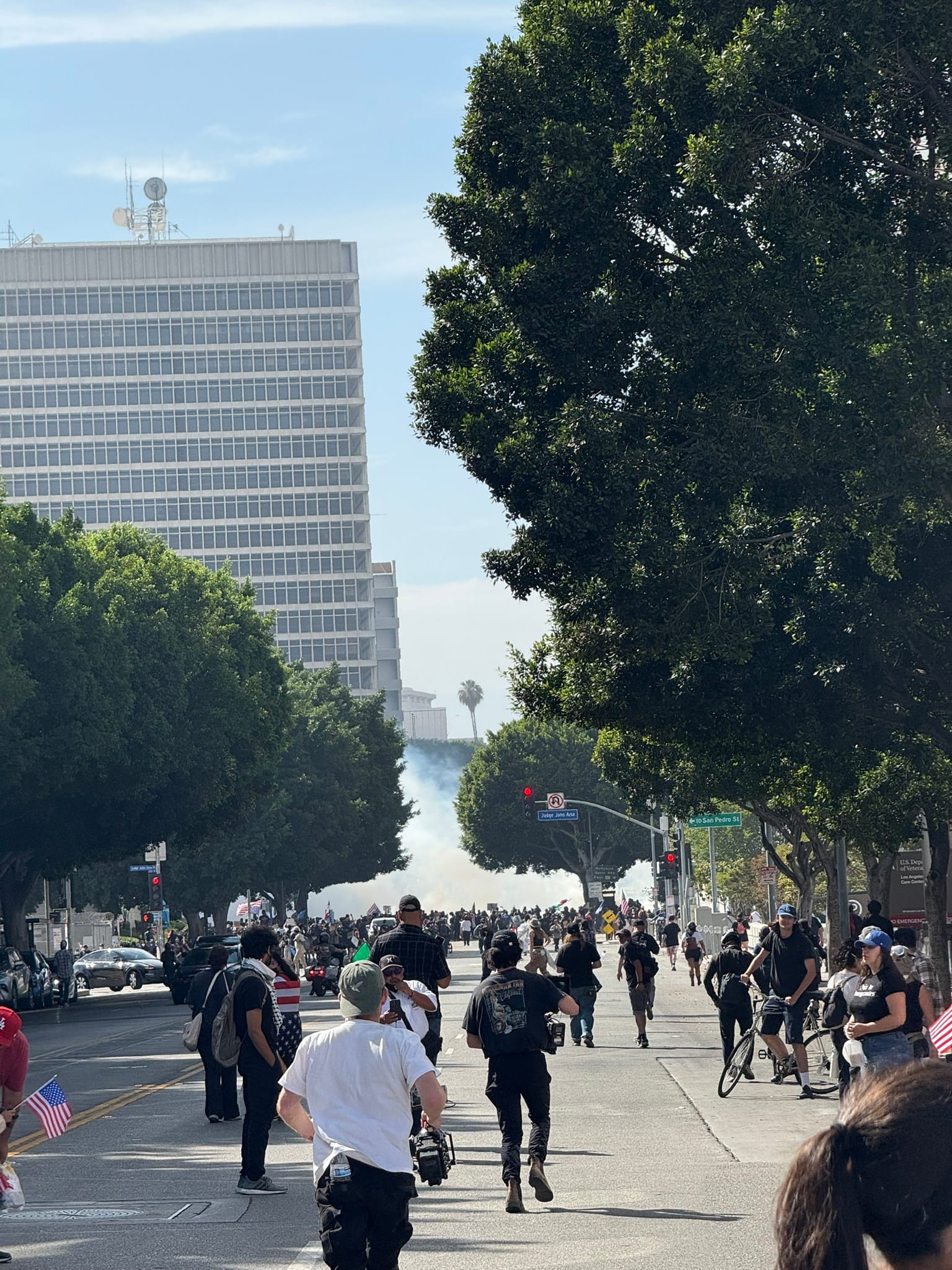 And yet, in spite of the comparatively broad, aimless, and non-confrontational nature of the No Kings protest, the police crackdown in LA was far more regimented this time around. A relatively small group of around a couple dozen people near the detention center were much more quickly dispersed. Explicit chants of “peaceful protest” and “non-violence” were met with excoriating force. Tear gas, flash bangs, horses, and flocks of vans shuttling officers clad in armor wielding disproportionate weapons against unarmed protestors saturated the streets. Beneath the amber glow of the late afternoon sun, a cacophony of detonations and screams rang out across the city’s urban core. It was complete mayhem, and the entire demonstration was quickly locked down and dispersed.