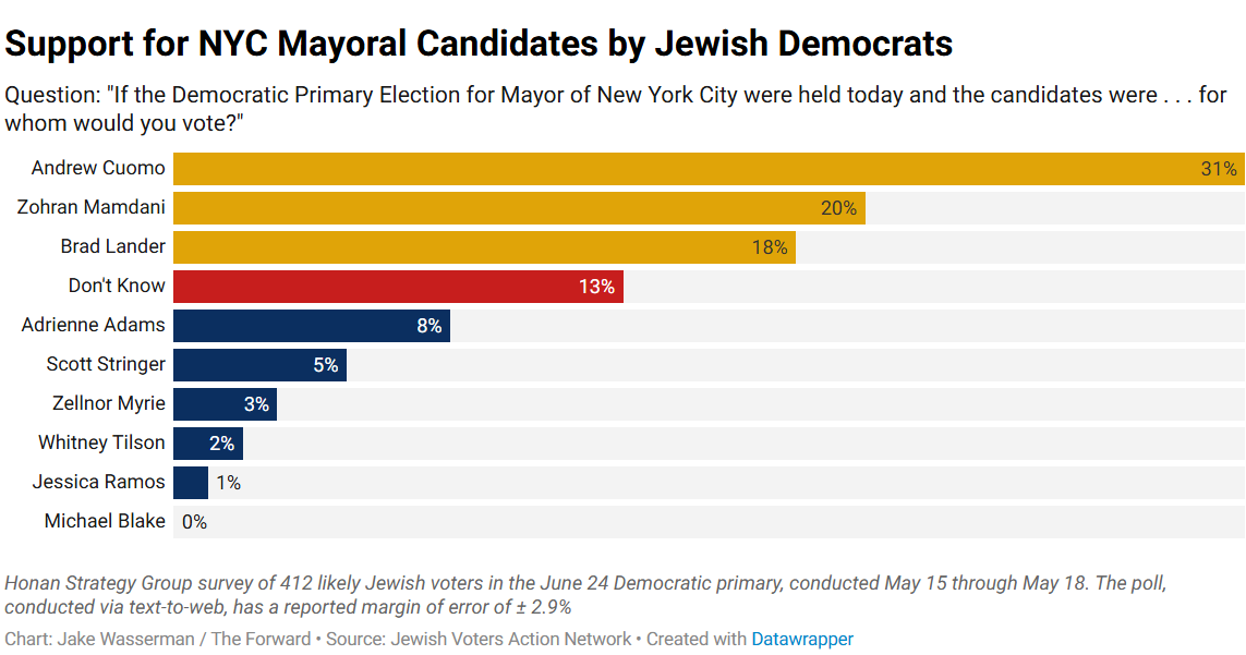 (Cuomo has near-majority support among Orthodox voters. Mamdani, a onetime supporter of the BDS movement, polls around zero percent among those voters.)